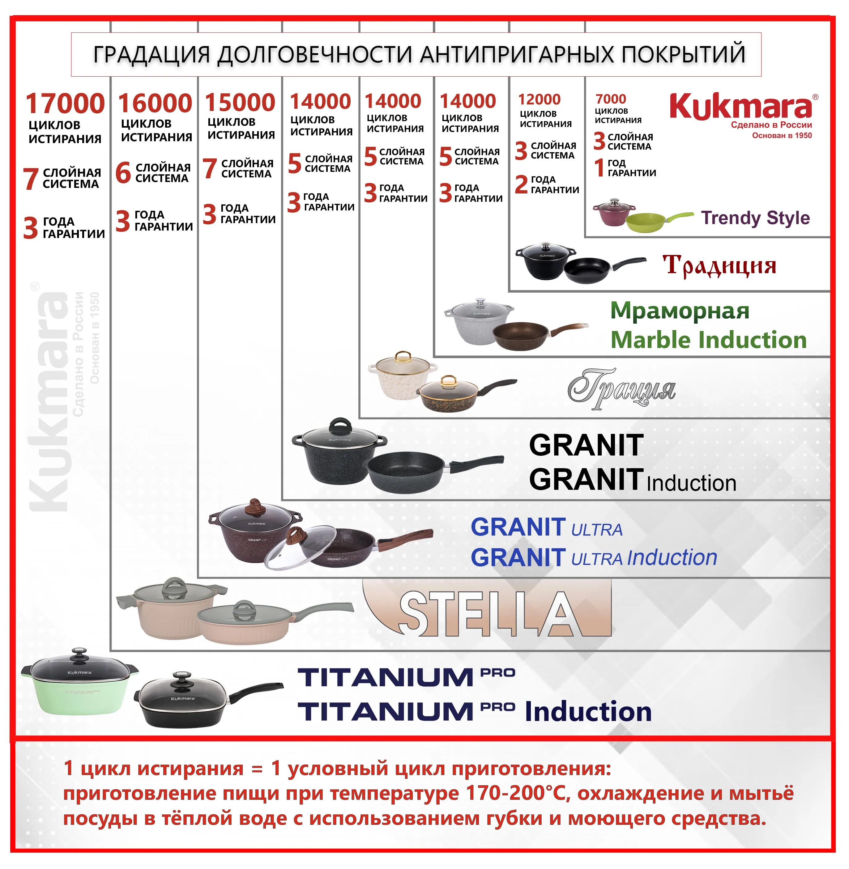 Коллекция “Granit Ultra” обладает ультрапрочной системой  7-слойного антипригарного покрытия европейского качества, усиленным сверхтвердыми минеральными частицами нового поколения, близкими по твердости алмазу. Такое покрытие гарантирует долгий срок службы даже при ежедневной эксплуатации с использованием неострых металлических кухонных принадлежностей. Покрытие выдерживает не менее 16 000-15 000 циклов истирания.